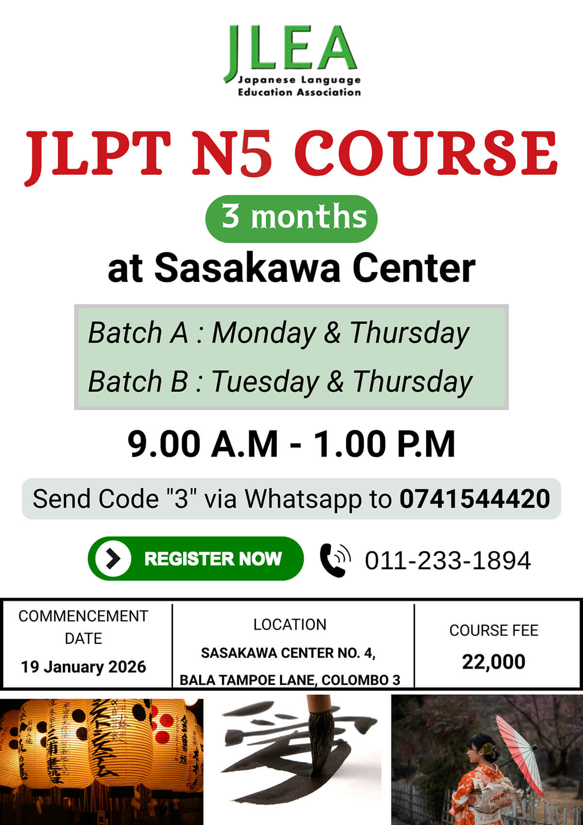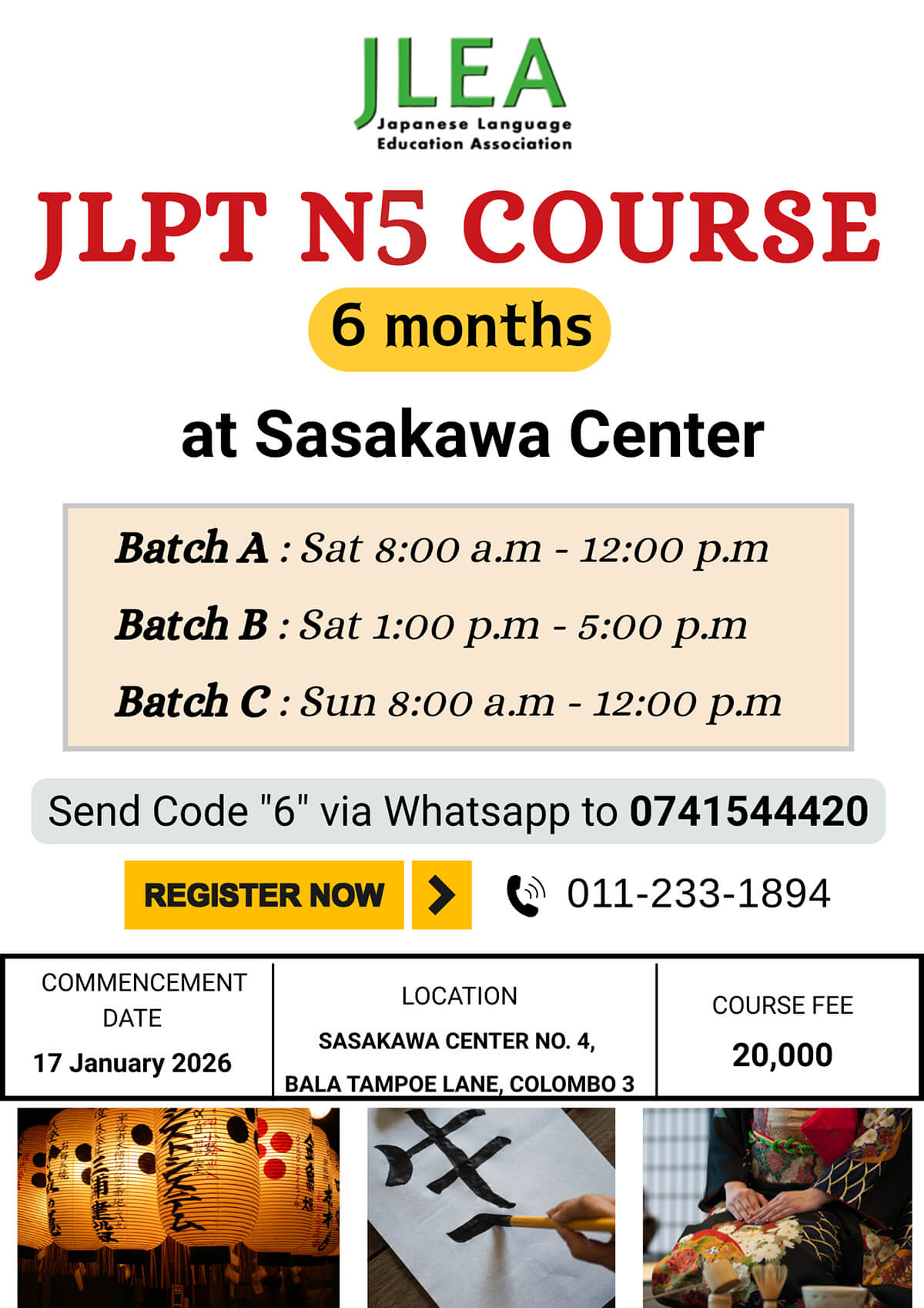 Japanese and Sri Lankan teachers, with very high level of proficiency in teaching the Japanese Language are engaged by JLEA in conducting weekday and weekend classes. Classes are conducted in 2 semesters per year (six months/semester) containing 80 hours per semester.