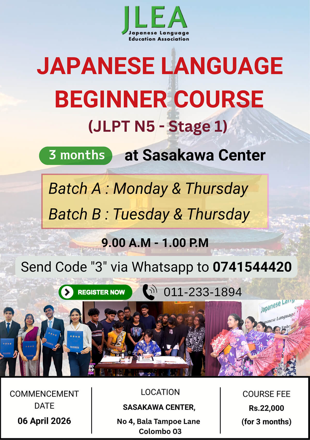 Japanese Language Education Association (JLEA) is a part of Japan Sri Lanka Technical & Cultural Association Trust (JASTECA), which serves as the pioneer organization in Sri Lanka disseminating the Japanese Language in Sri Lanka. JLEA has been carrying out this service for over 30 years.